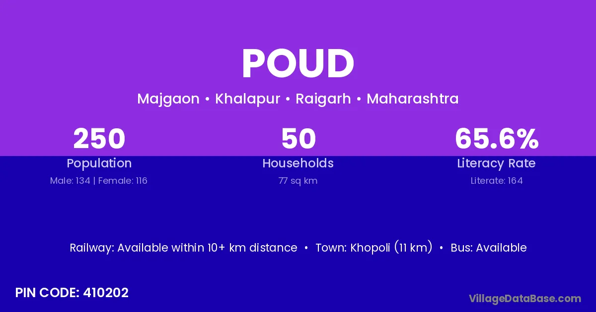 Khopoli (11 km) is the nearest town to Poud village for major economic activities and is located approximately 11 km away.