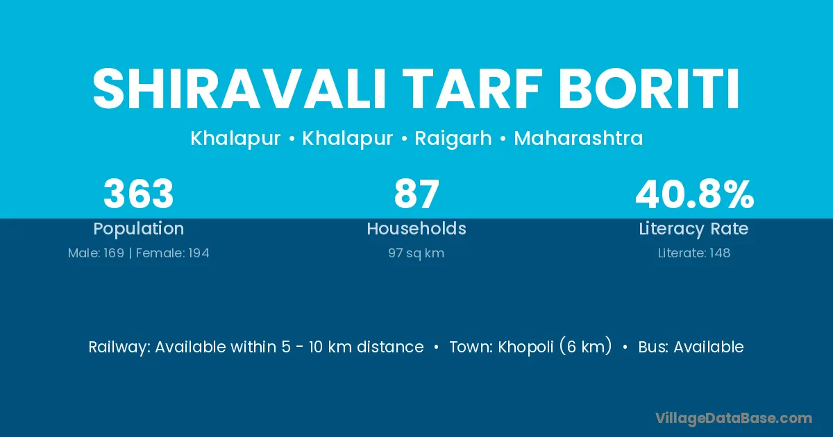 Khopoli (6 km) is the nearest town to Shiravali Tarf Boriti village for major economic activities and is located approximately 6 km away.