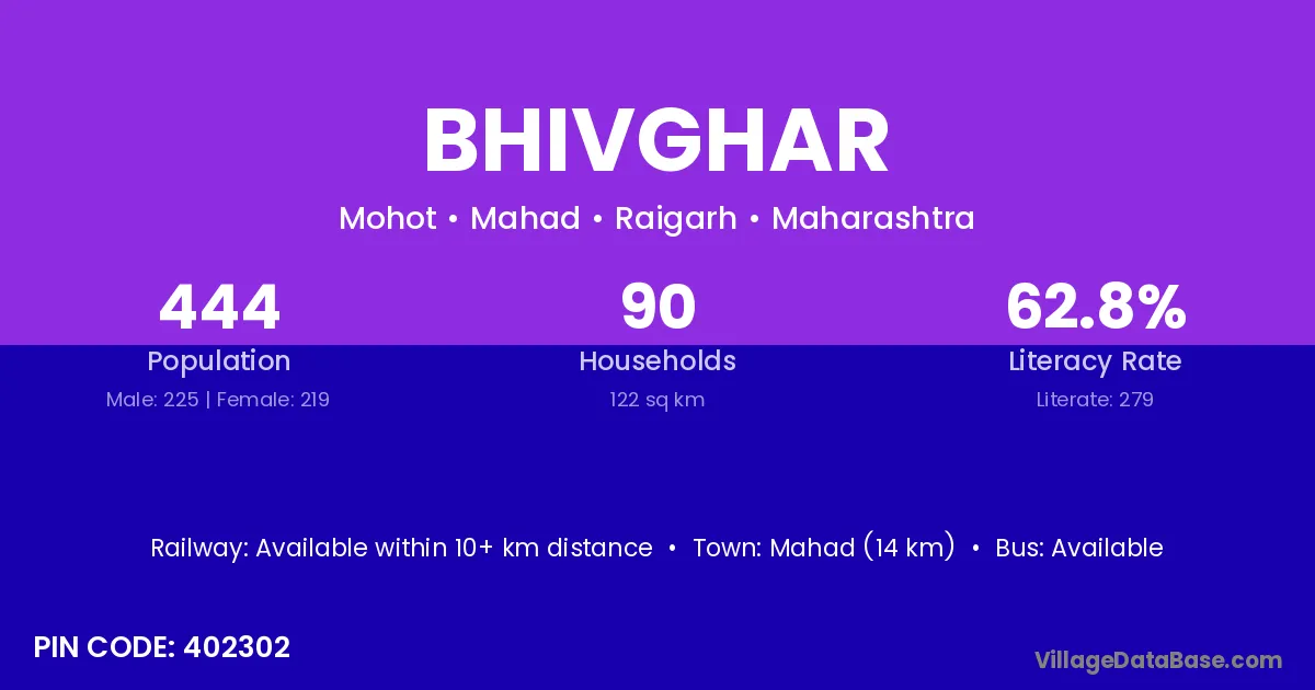 Mahad (14 km) is the nearest town to Bhivghar village for major economic activities and is located approximately 14 km away.