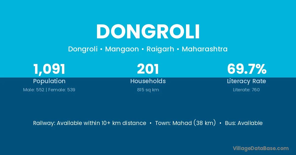 Mahad (15 km) is the nearest town to Dongroli village for major economic activities and is located approximately 15 km away.