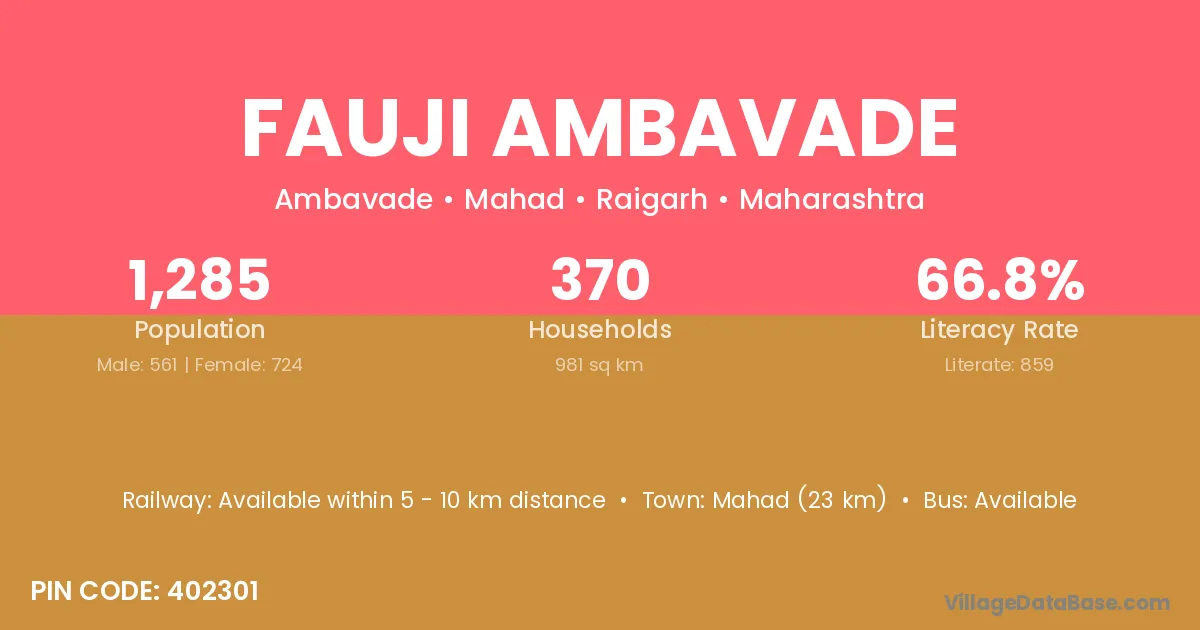 Mahad (23 km) is the nearest town to Fauji Ambavade village for major economic activities and is located approximately 23 km away.