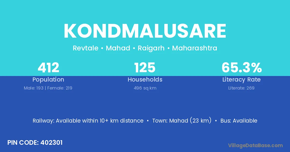 Mahad (23 km) is the nearest town to Kondmalusare village for major economic activities and is located approximately 23 km away.