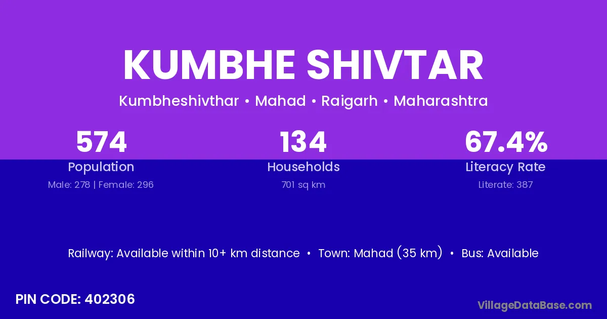 Mahad (35 km) is the nearest town to Kumbhe Shivtar village for major economic activities and is located approximately 35 km away.