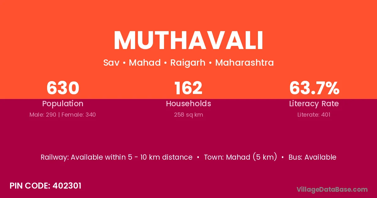 Mahad (5 km) is the nearest town to Muthavali village for major economic activities and is located approximately 5 km away.