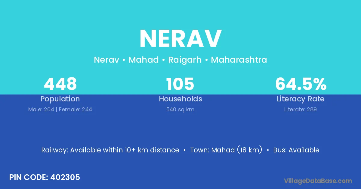 Mahad (18 km) is the nearest town to Nerav village for major economic activities and is located approximately 18 km away.