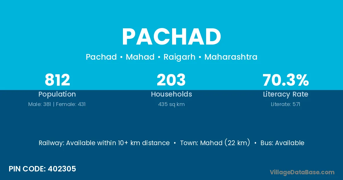 Mahad (22 km) is the nearest town to Pachad village for major economic activities and is located approximately 22 km away.