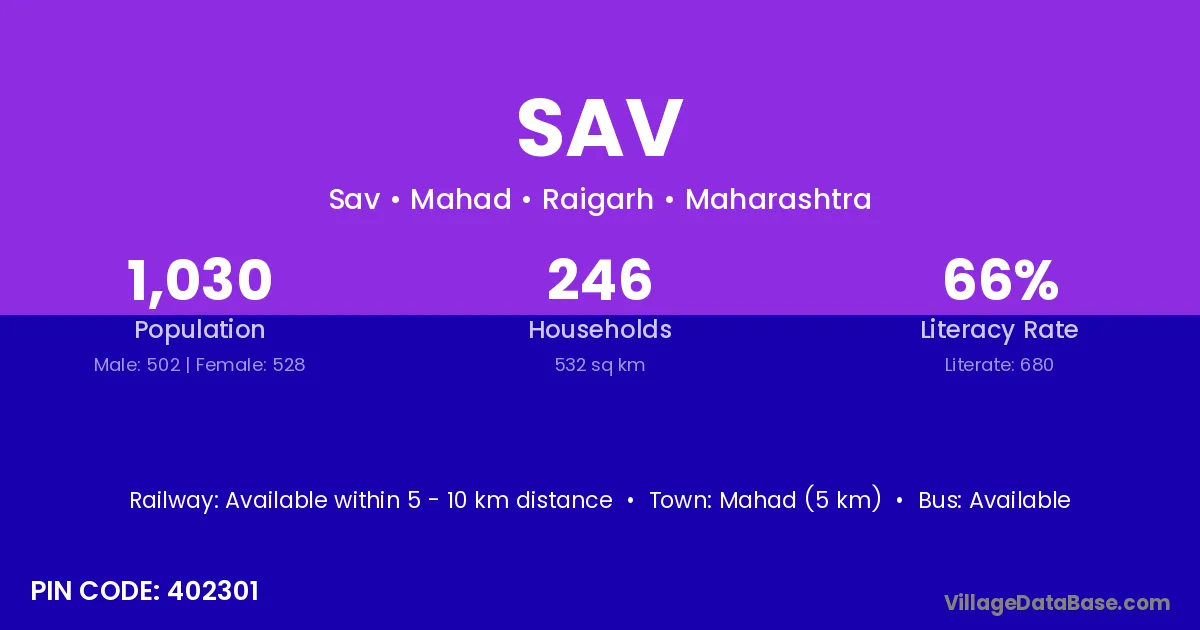 Mahad (5 km) is the nearest town to Sav village for major economic activities and is located approximately 5 km away.