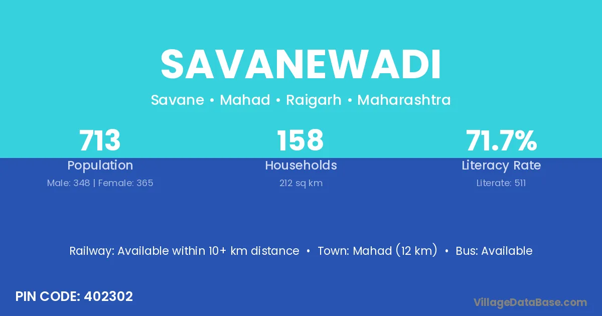 Mahad (12 km) is the nearest town to Savanewadi village for major economic activities and is located approximately 12 km away.