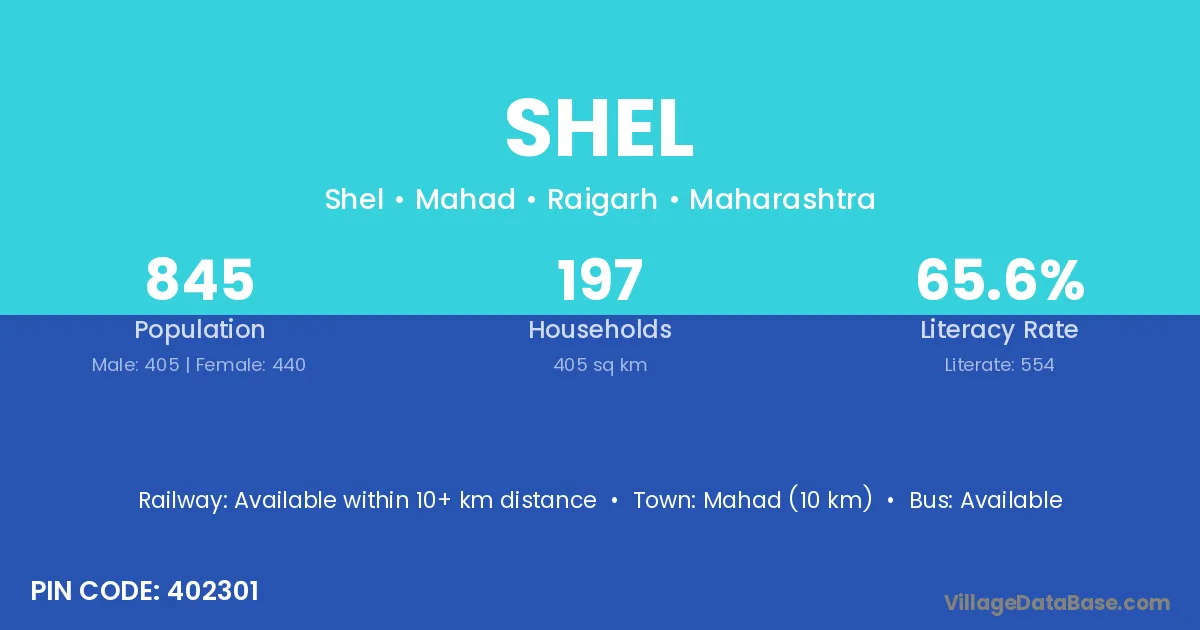 Mahad (10 km) is the nearest town to Shel village for major economic activities and is located approximately 10 km away.