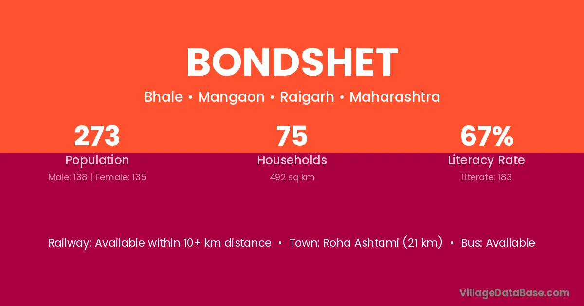 Roha Ashtami (21 km) is the nearest town to Bondshet village for major economic activities and is located approximately 21 km away.