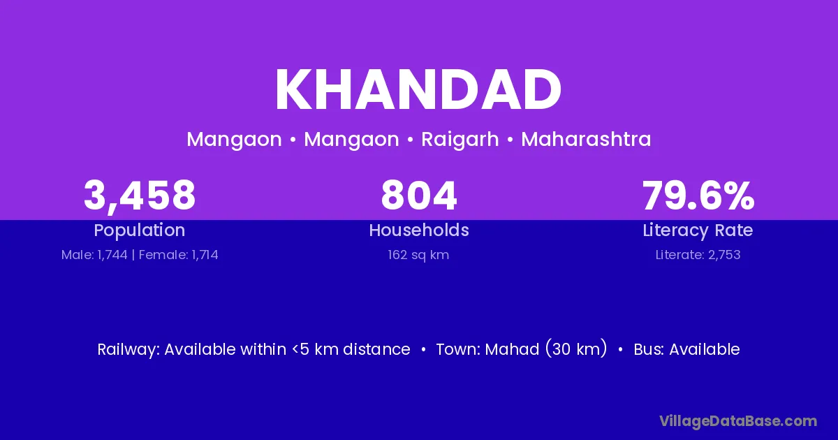 Mahad (30 km) is the nearest town to Khandad village for major economic activities and is located approximately 30 km away.