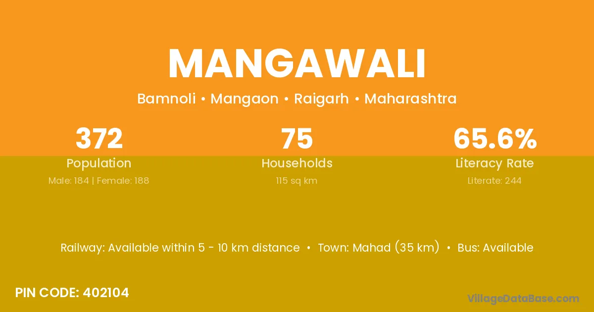 Mahad (35 km) is the nearest town to Mangawali village for major economic activities and is located approximately 35 km away.
