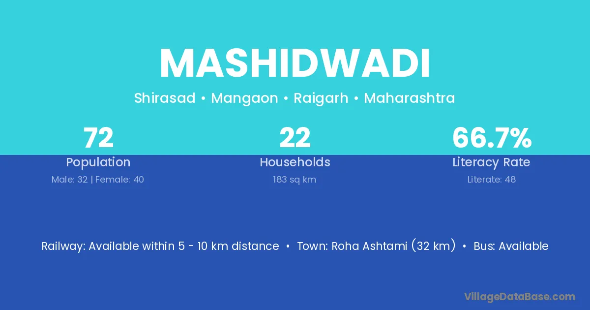 Roha Ashtami (32 km) is the nearest town to Mashidwadi village for major economic activities and is located approximately 32 km away.
