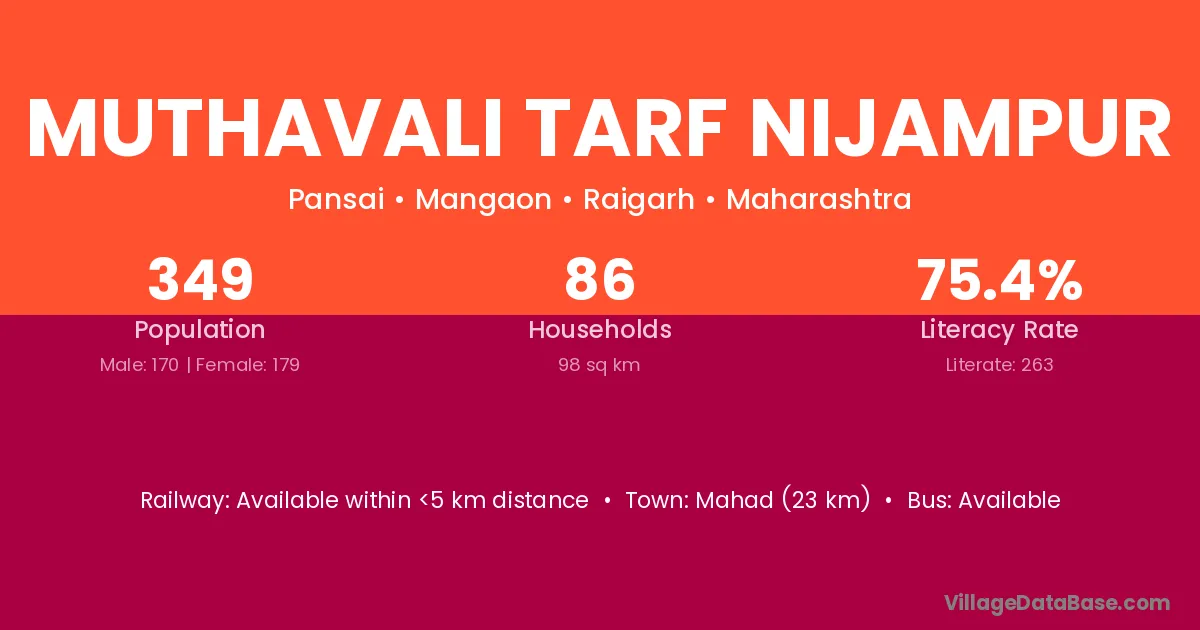Mahad (23 km) is the nearest town to Muthavali Tarf Nijampur village for major economic activities and is located approximately 23 km away.