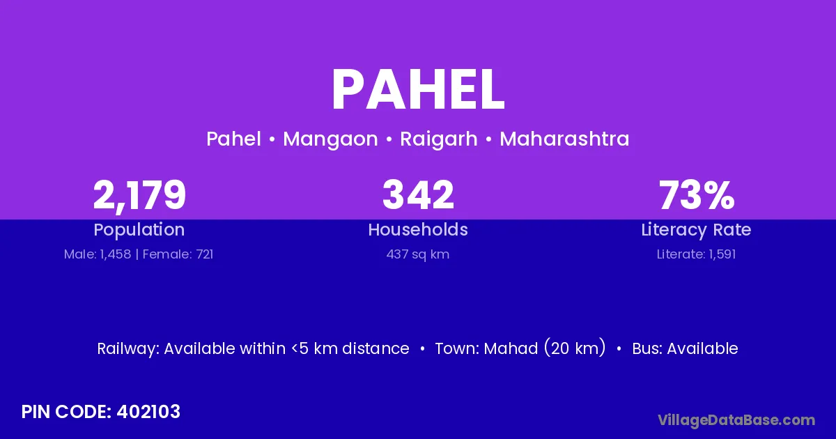 Mahad (20 km) is the nearest town to Pahel village for major economic activities and is located approximately 20 km away.