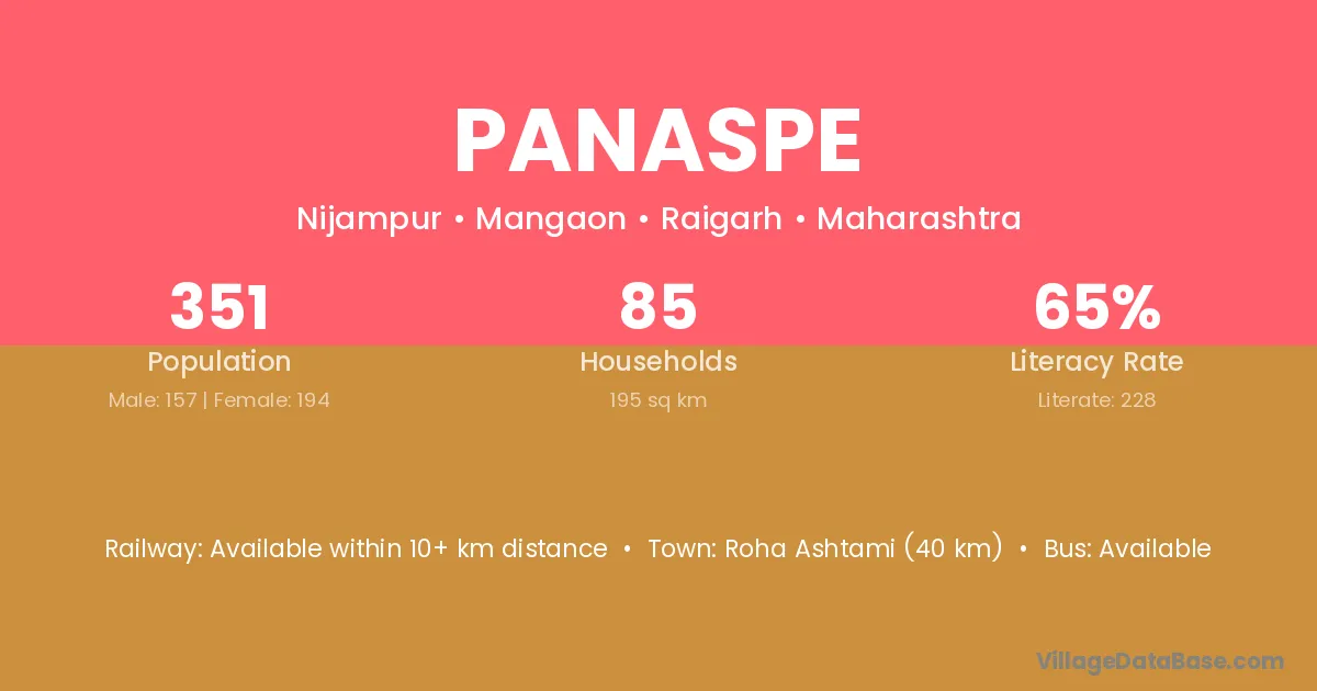 Roha Ashtami (40 km) is the nearest town to Panaspe village for major economic activities and is located approximately 40 km away.