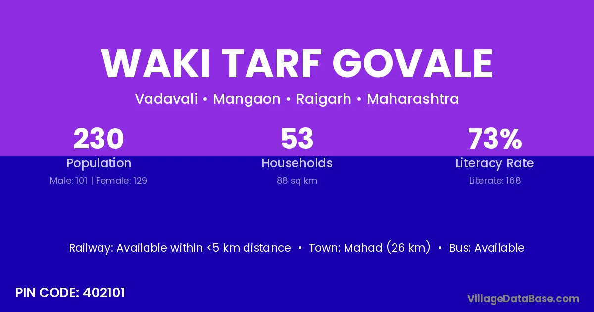 Mahad (26 km) is the nearest town to Waki Tarf Govale village for major economic activities and is located approximately 26 km away.