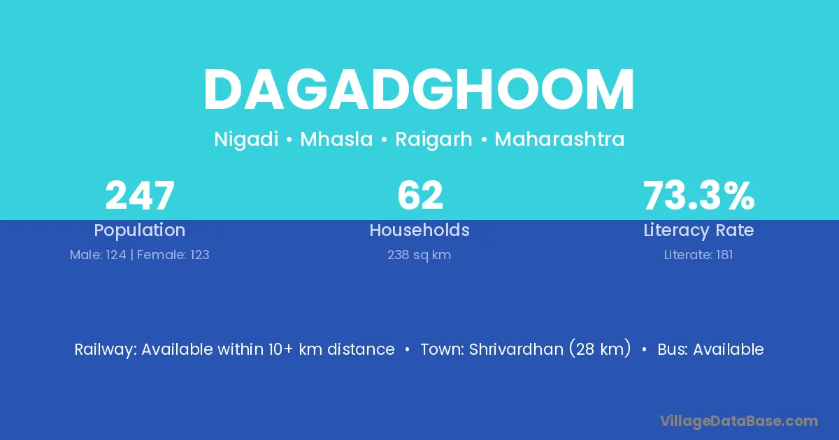 Shrivardhan (28 km) is the nearest town to Dagadghoom village for major economic activities and is located approximately 28 km away.