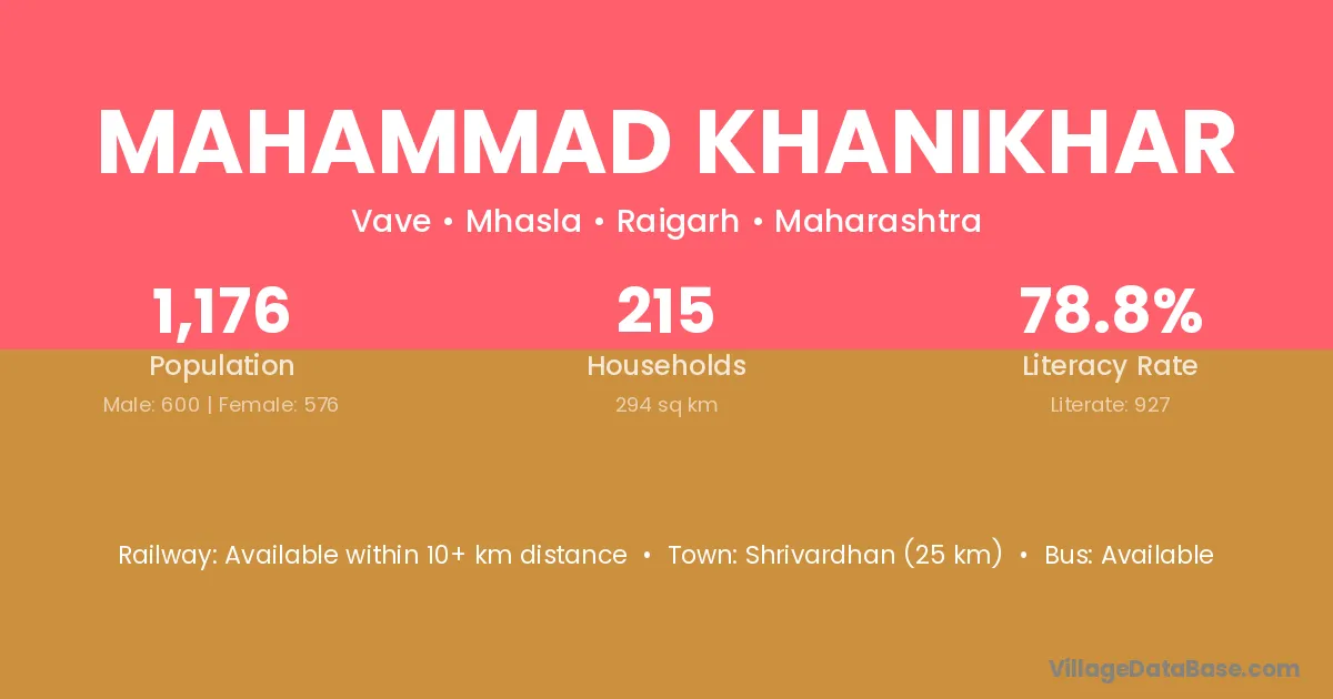 Shrivardhan (25 km) is the nearest town to Mahammad Khanikhar village for major economic activities and is located approximately 25 km away.