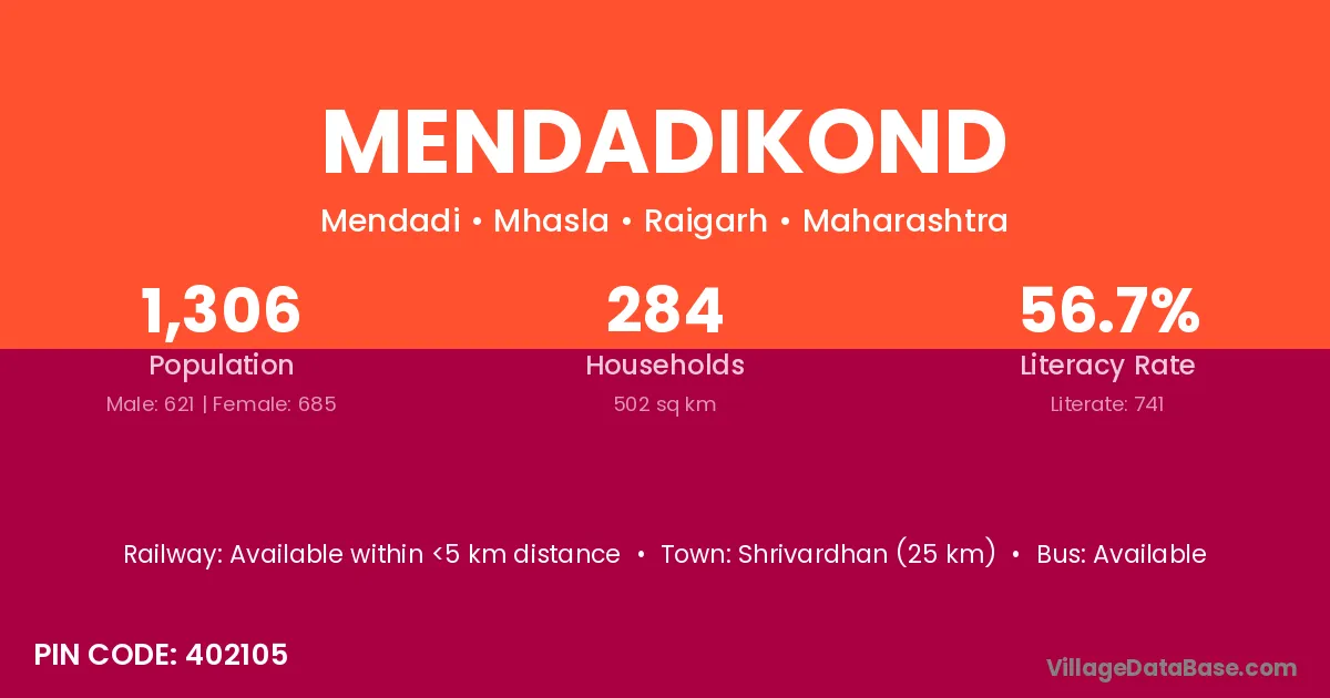 Shrivardhan (25 km) is the nearest town to Mendadikond village for major economic activities and is located approximately 25 km away.