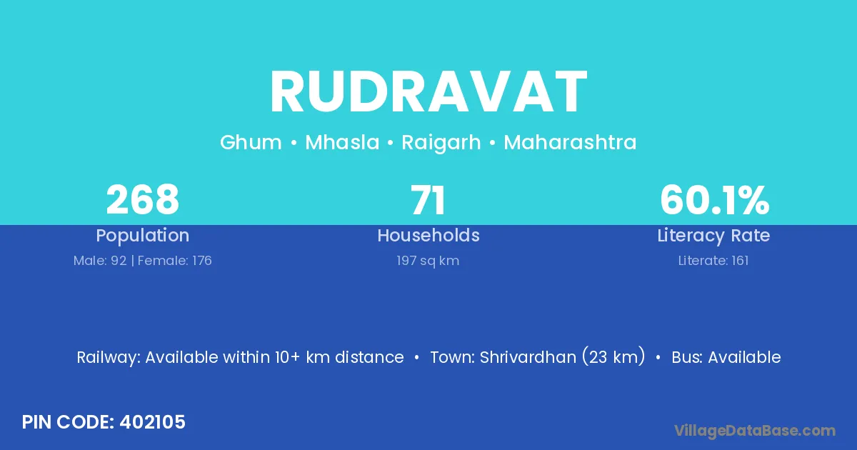 Shrivardhan (23 km) is the nearest town to Rudravat village for major economic activities and is located approximately 23 km away.