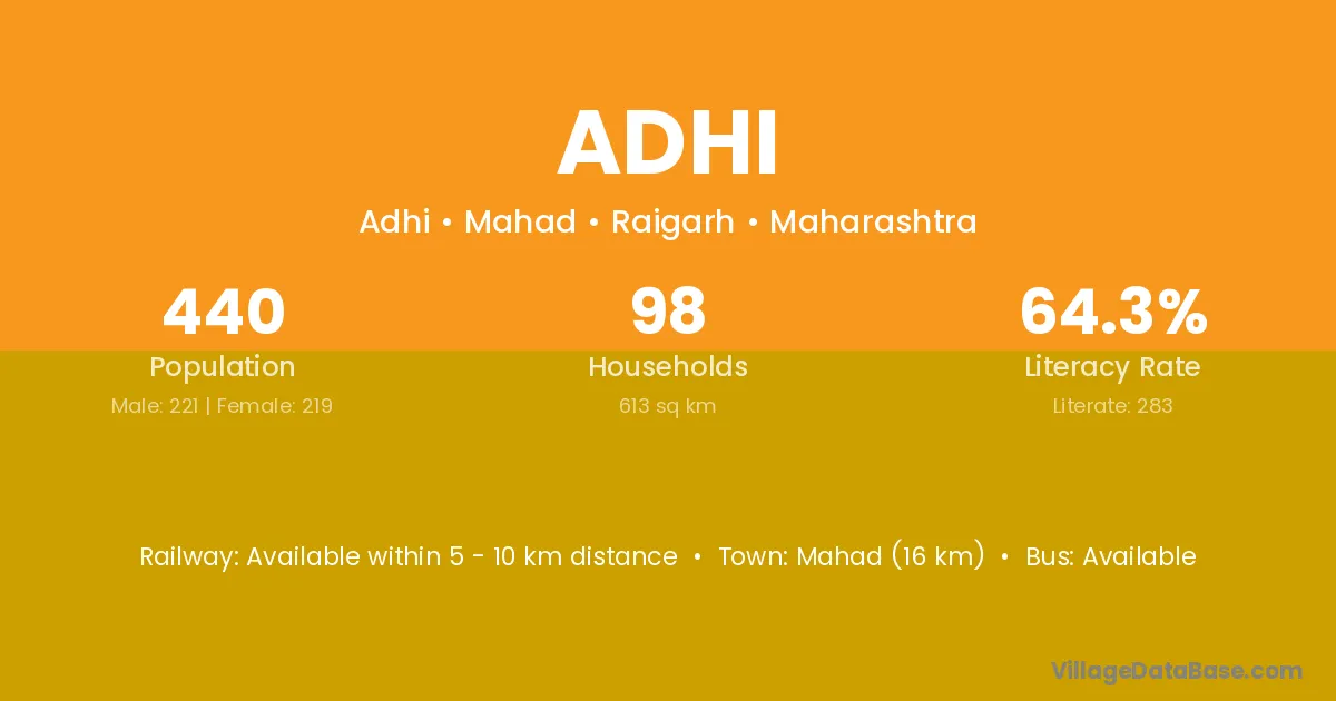 Murud (12 km) is the nearest town to Adhi village for major economic activities and is located approximately 12 km away.