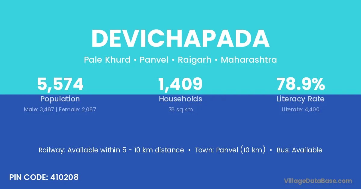 Panvel (10 km) is the nearest town to Devichapada village for major economic activities and is located approximately 10 km away.