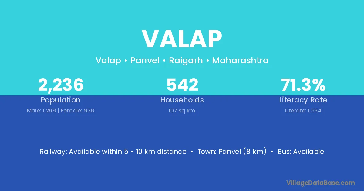 Panvel (8 km) is the nearest town to Valap village for major economic activities and is located approximately 8 km away.