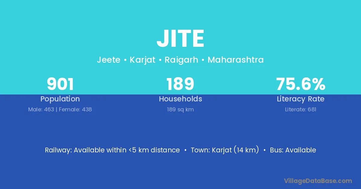 The literacy rate of Jite village is 66.25%. Male literacy stands at 73.70% and female literacy at 58.02%.