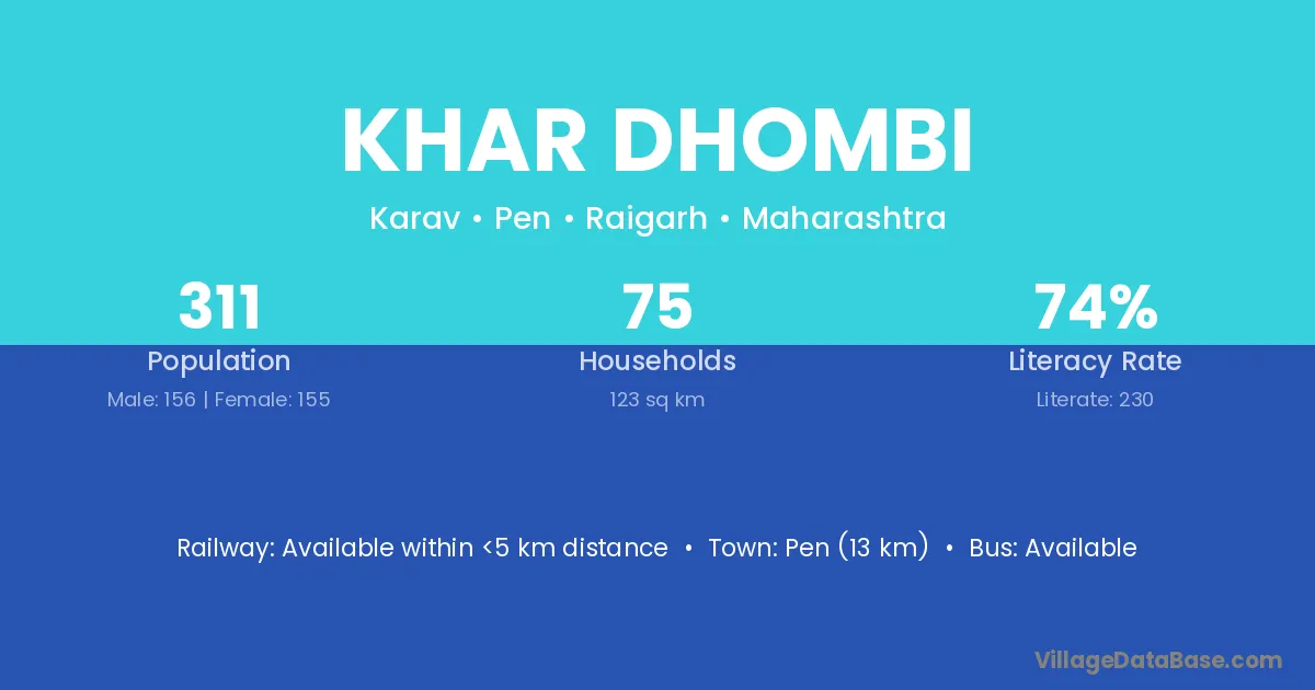 Pen (13 km) is the nearest town to Khar Dhombi village for major economic activities and is located approximately 13 km away.