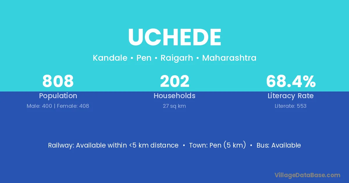 The literacy rate of Uchede village is 68.44%. Male literacy stands at 73.50% and female literacy at 63.48%.