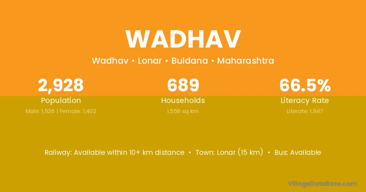 The literacy rate of Wadhav village is 74.04%. Male literacy stands at 81.32% and female literacy at 66.46%.