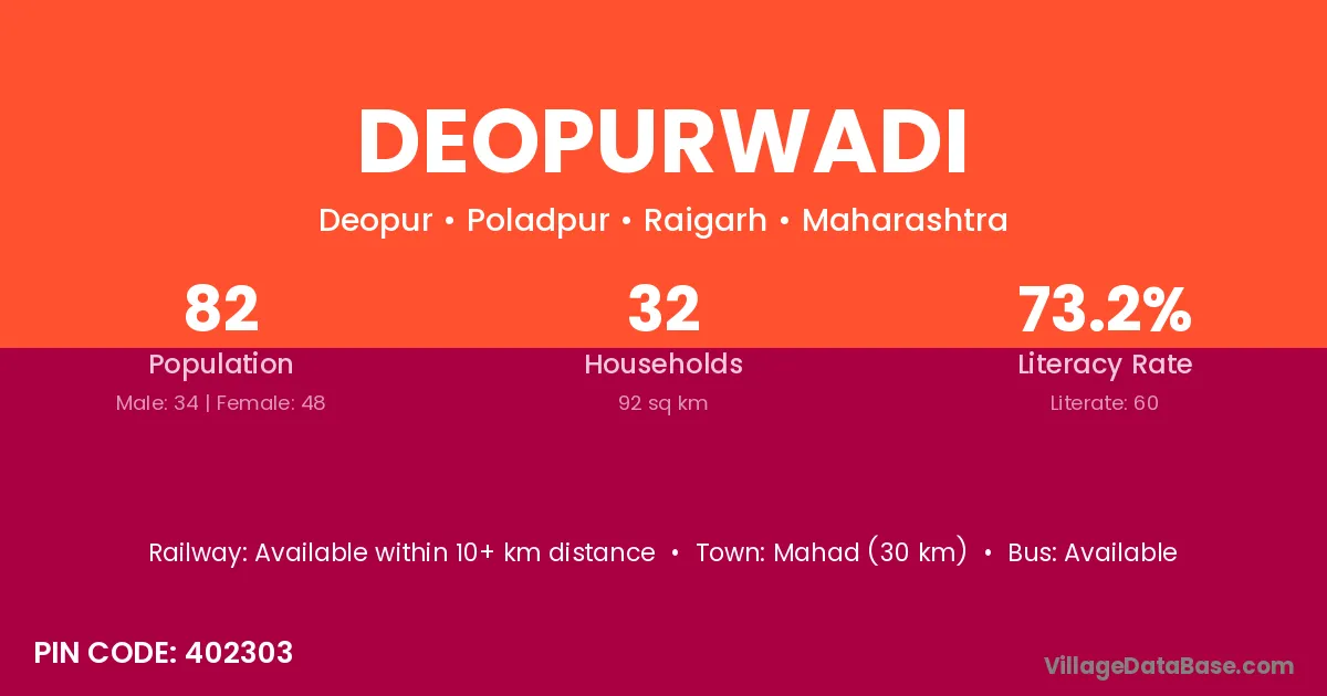 Mahad (30 km) is the nearest town to Deopurwadi village for major economic activities and is located approximately 30 km away.