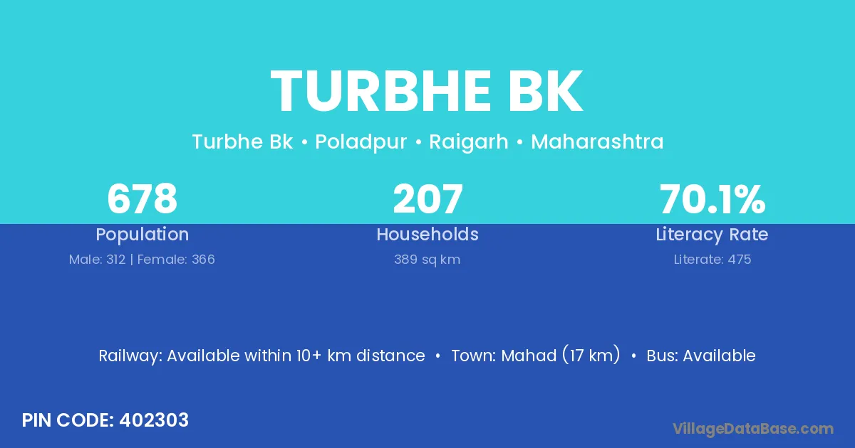 Mahad (17 km) is the nearest town to Turbhe Bk village for major economic activities and is located approximately 17 km away.
