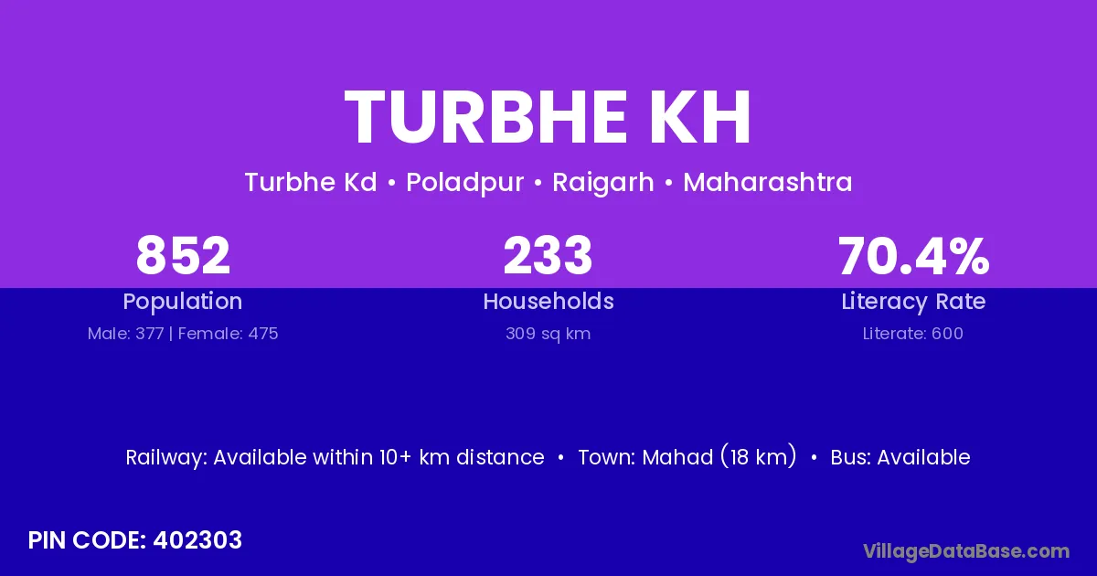 Mahad (18 km) is the nearest town to Turbhe Kh village for major economic activities and is located approximately 18 km away.