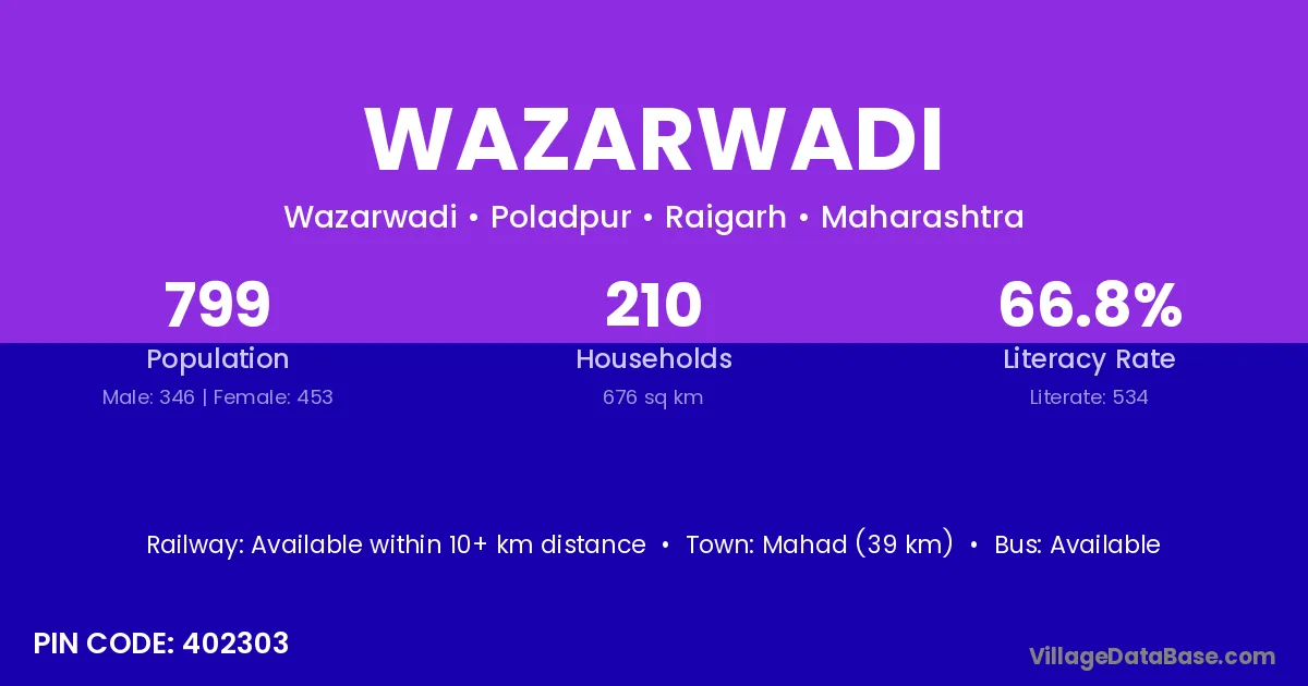 Mahad (39 km) is the nearest town to Wazarwadi village for major economic activities and is located approximately 39 km away.