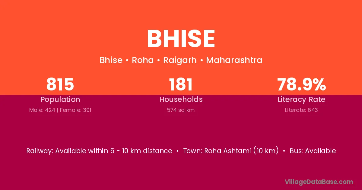 Roha Ashtami (10 km) is the nearest town to Bhise village for major economic activities and is located approximately 10 km away.