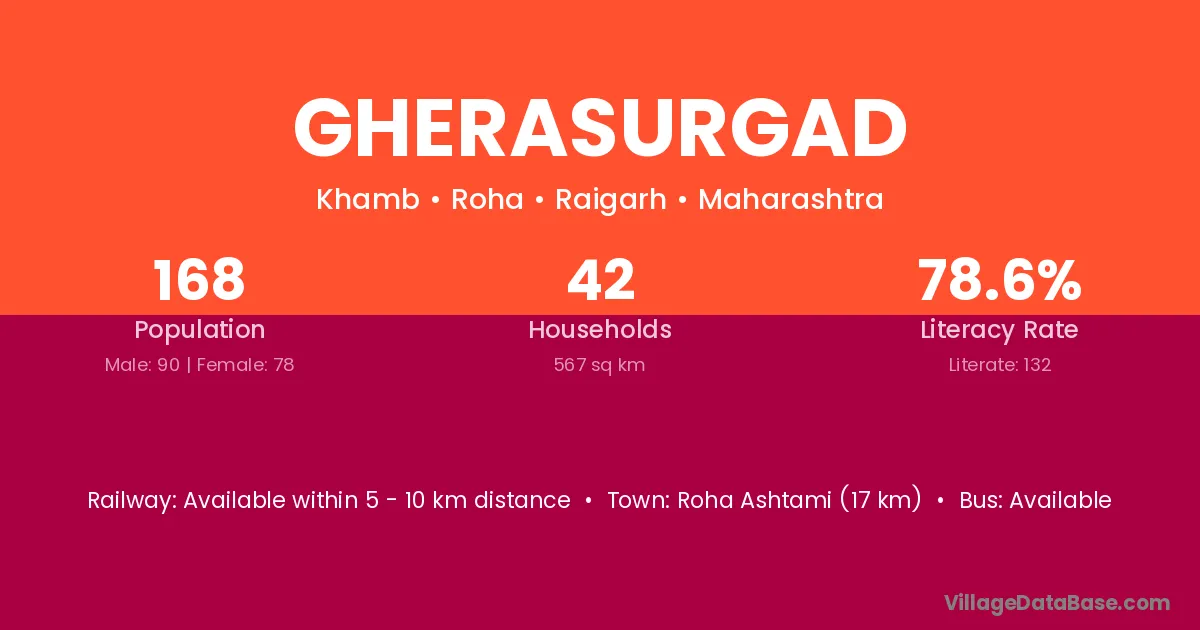 Roha Ashtami (17 km) is the nearest town to Gherasurgad village for major economic activities and is located approximately 17 km away.