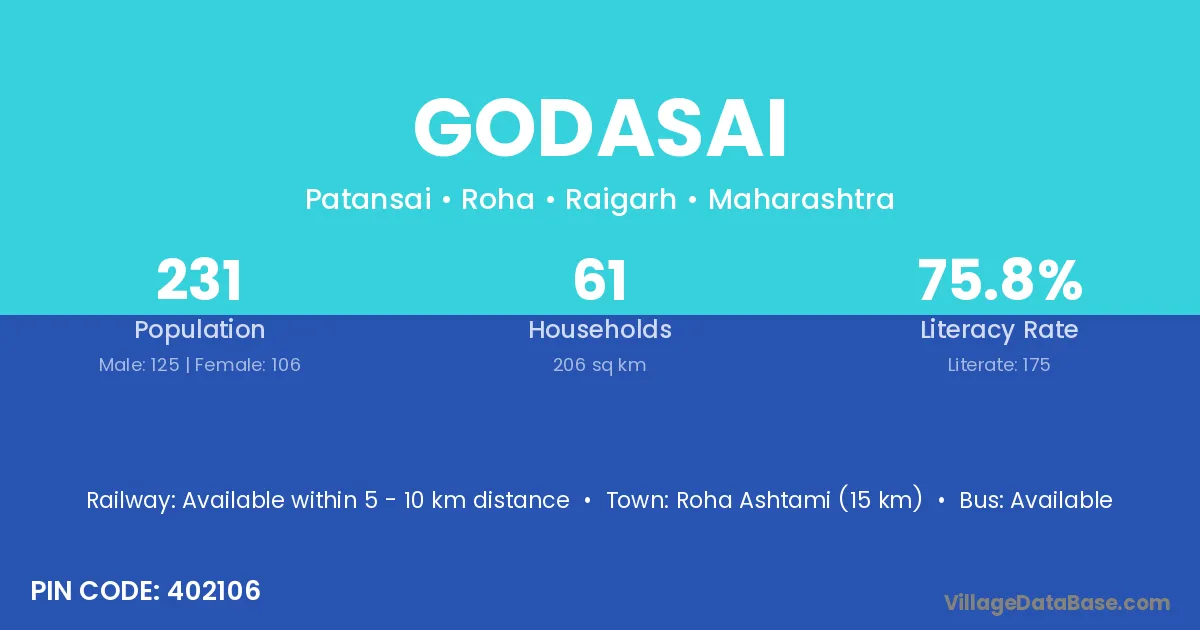 Roha Ashtami (15 km) is the nearest town to Godasai village for major economic activities and is located approximately 15 km away.