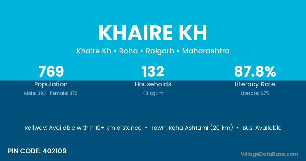 Roha Ashtami (20 km) is the nearest town to Khaire Kh village for major economic activities and is located approximately 20 km away.