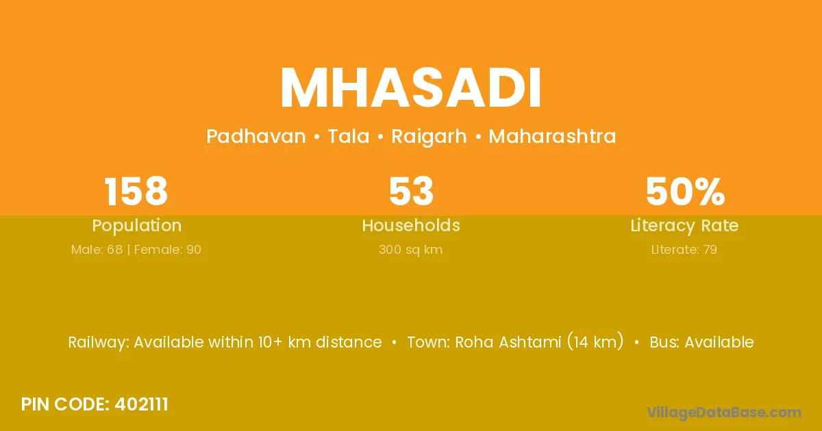 Roha Ashtami (29 km) is the nearest town to Mhasadi village for major economic activities and is located approximately 29 km away.