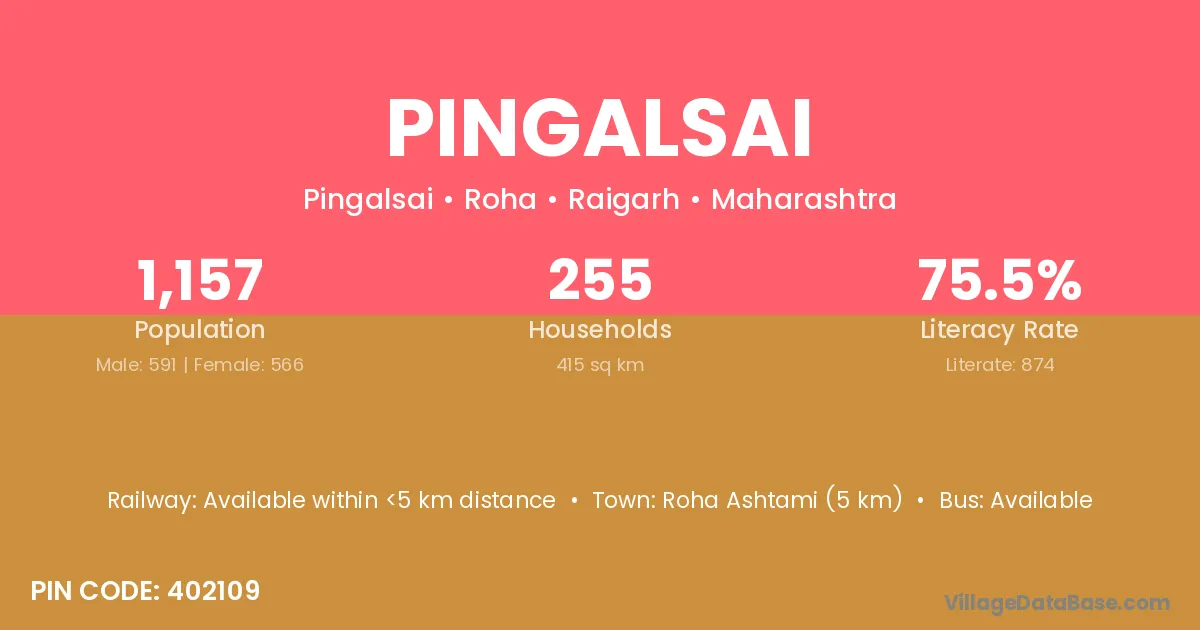 Roha Ashtami (5 km) is the nearest town to Pingalsai village for major economic activities and is located approximately 5 km away.