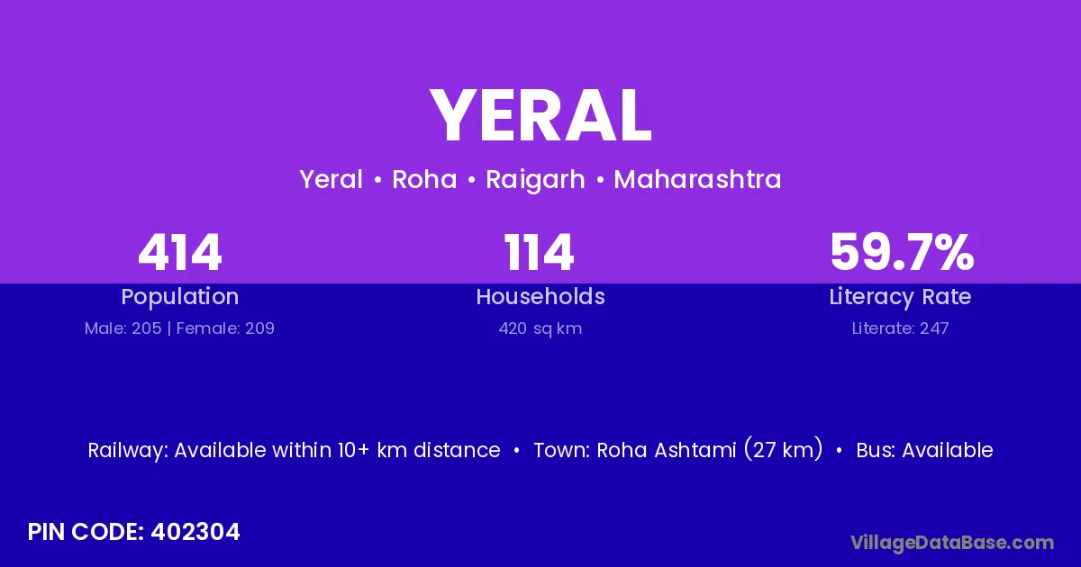 Roha Ashtami (27 km) is the nearest town to Yeral village for major economic activities and is located approximately 27 km away.