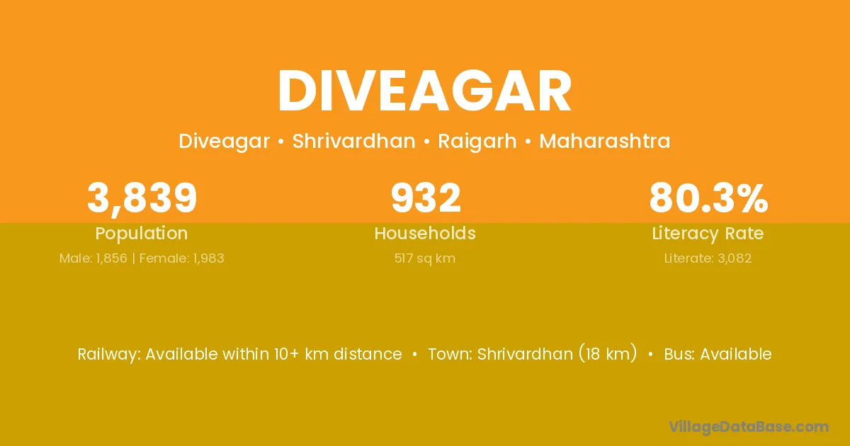 Diveagar village has a total population of 3,839 people, of which 1,856 are males and 1,983 are females.