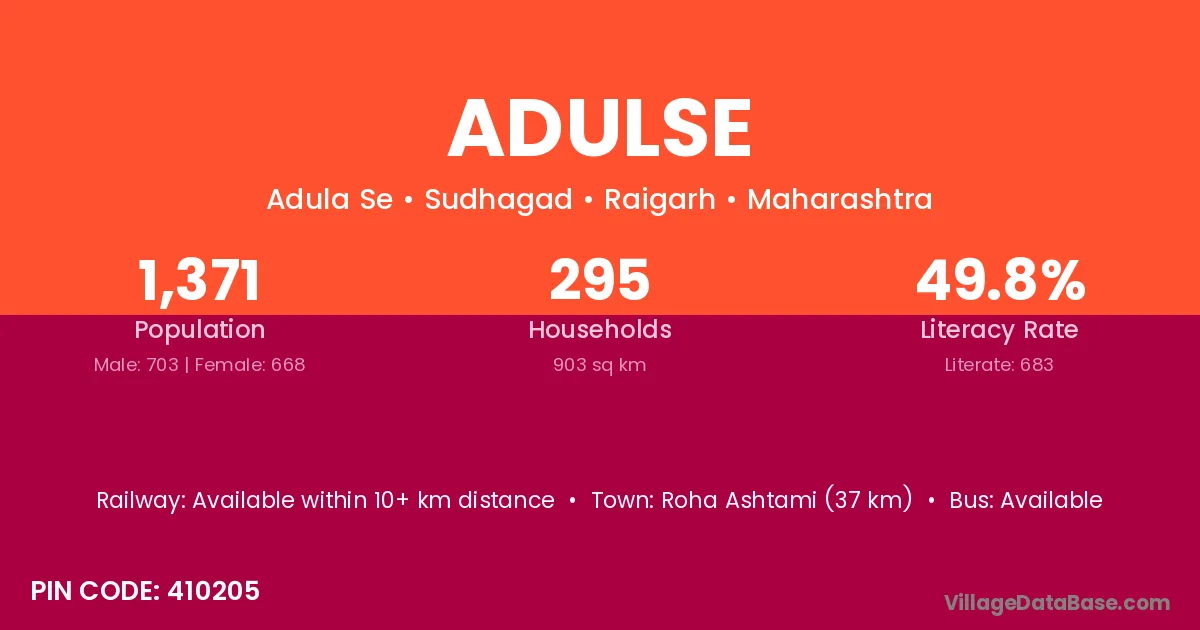 Roha Ashtami (37 km) is the nearest town to Adulse village for major economic activities and is located approximately 37 km away.