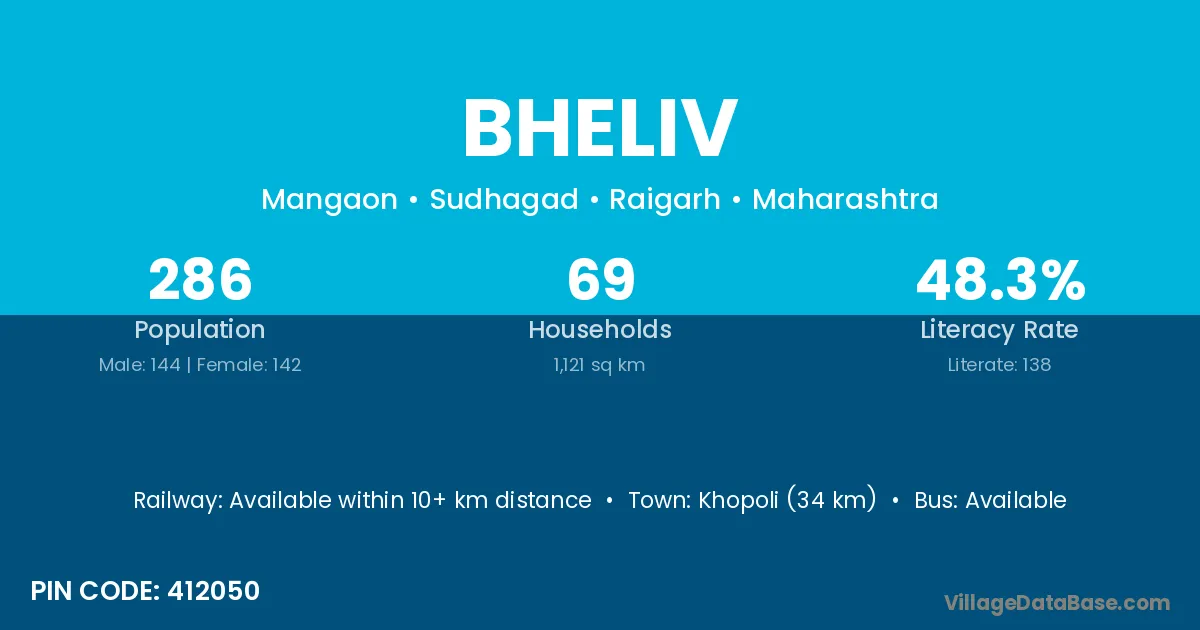 Khopoli (34 km) is the nearest town to Bheliv village for major economic activities and is located approximately 34 km away.