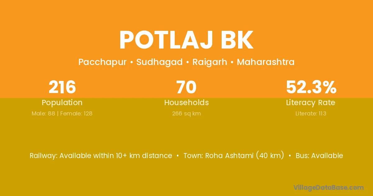 Roha Ashtami (40 km) is the nearest town to Potlaj Bk village for major economic activities and is located approximately 40 km away.