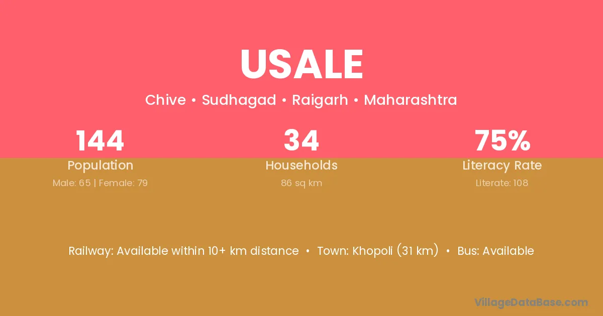 Khopoli (31 km) is the nearest town to Usale village for major economic activities and is located approximately 31 km away.