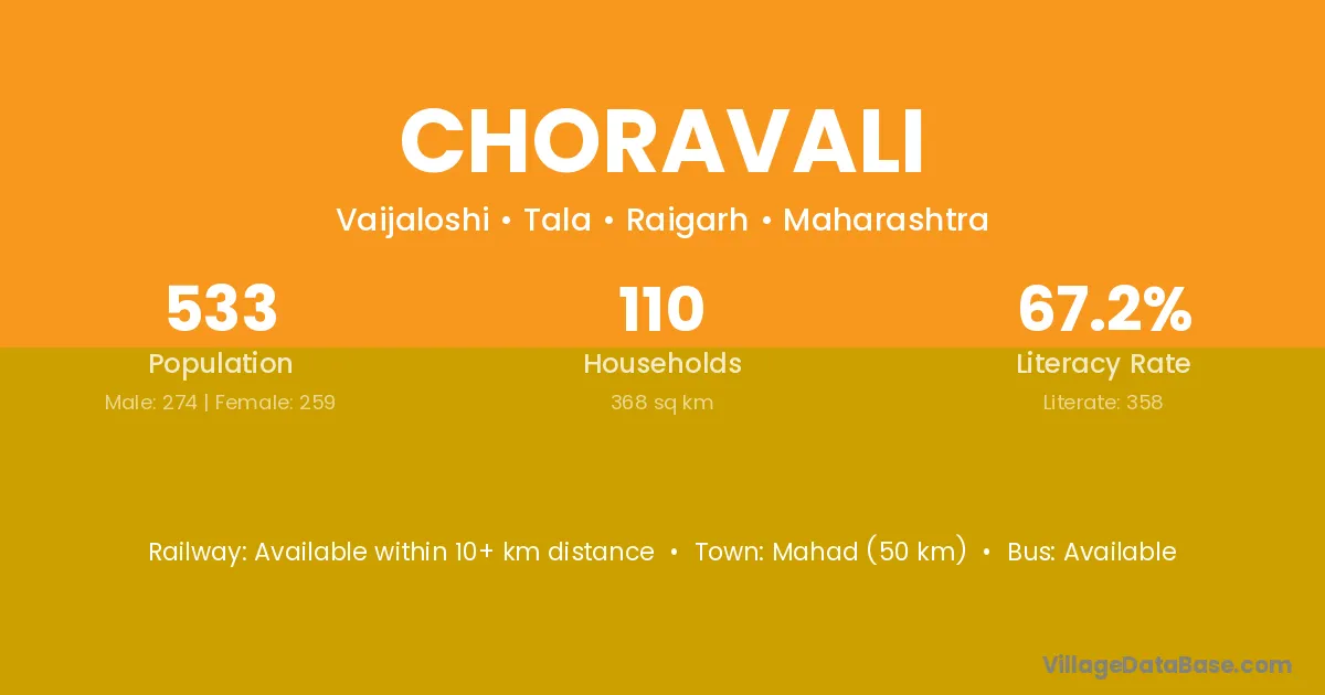 Mahad (50 km) is the nearest town to Choravali village for major economic activities and is located approximately 50 km away.