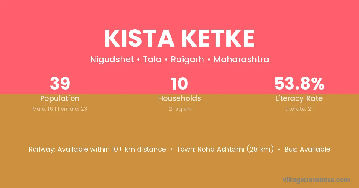 Roha Ashtami (28 km) is the nearest town to Kista Ketke village for major economic activities and is located approximately 28 km away.